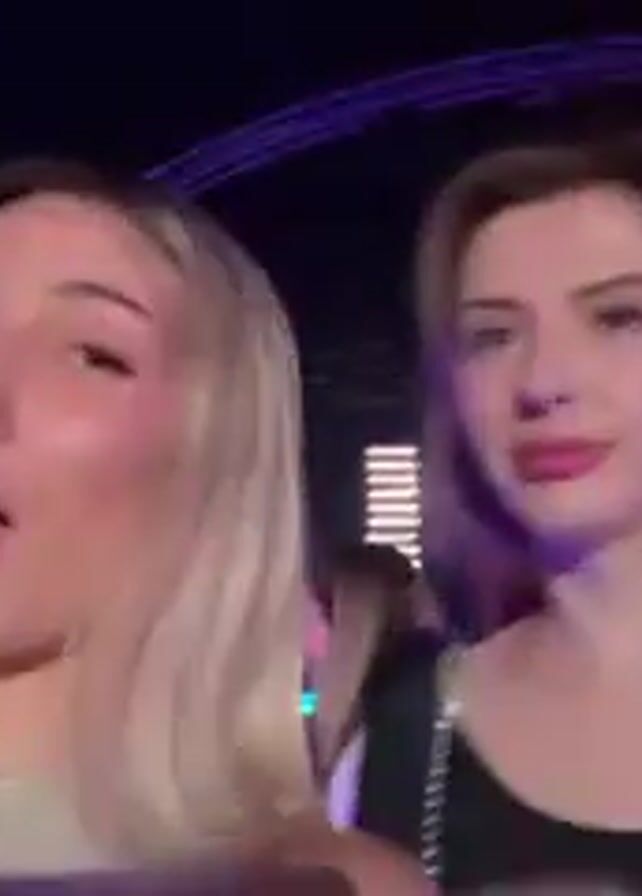 Two young women are close together, facing the camera, presumably taking a selfie or video of themselves. They are at what appears to be a nightclub or party, based on the lighting and the presence of other people in the background. The woman on the left has blonde hair, and she's wearing a light-colored top. The woman on the right has light brown hair, and she is wearing a black top. The lighting in the venue is a mix of colors, including pink, purple, yellow, and white. There are light fixtures or architectural elements visible above them. They appear to be enjoying themselves, smiling and talking to the camera.