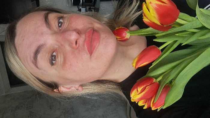 An adult female is depicted in a close-up indoor portrait, positioned in the city of Elektrostal, Russia. The woman, identified as Caucasian, has light skin with visible freckles and blonde hair. She wears a black top. Her left ear displays a small, dark stud piercing. Her eyebrows are dark, and her eyes have dark eyeliner. Her lips are made up with a reddish-coral color, and a small dark mole or piercing is present directly above the center of her upper lip. She holds a bouquet of approximately six tulips against her upper chest and shoulder area. The tulips feature closed or partially open petals that are primarily red with prominent yellow edges and flames, supported by green stems and leaves. The woman's gaze is directed forward, engaging the camera. The background is an indistinct indoor setting, with a light grey, possibly textured wall or wallpaper visible on the left side of the frame. On the right, dark, reflective objects, potentially kitchen appliances or furniture, are vaguely discernible.