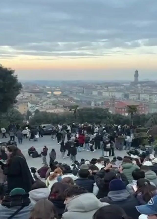large group of people gathered on an overlook, gazing at a cityscape under a cloudy sky with a hint of sunrise colors on the horizon. The cityscape appears to be a historical European city, with a river running through it, several bridges, and a prominent tower visible. Many people are standing, walking, or sitting, and seem to be enjoying the view. The atmosphere appears relaxed and communal. A few vehicles are visible in the background of the crowd.