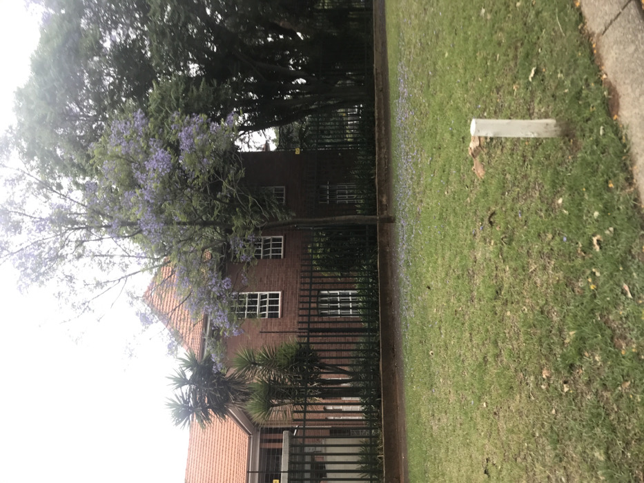 The image depicts a two-story red-brick building with a terracotta-tiled hip roof, viewed from across a grassy verge. The building features multiple rectangular windows with white frames and vertical security bars. In the foreground, a prominent jacaranda tree with purple blossoms and green leaves partially obscures the building. Numerous fallen purple jacaranda petals are scattered across the green grass and the grey concrete curb. A tall, dark metal palisade fence with vertical bars separates the public lawn from the building property. To the left of the jacaranda tree, a tall plant with spiky green leaves is visible, while dense, dark green trees stand to the right. A small, white, rectangular post is embedded in the grass near the curb in the lower right quadrant. The sky is overcast. The presence of a blooming jacaranda tree and the architectural style are characteristic of Johannesburg, South Africa, suggesting an established area within the city during the spring or early summer. No individuals or active movements are visible in the scene.