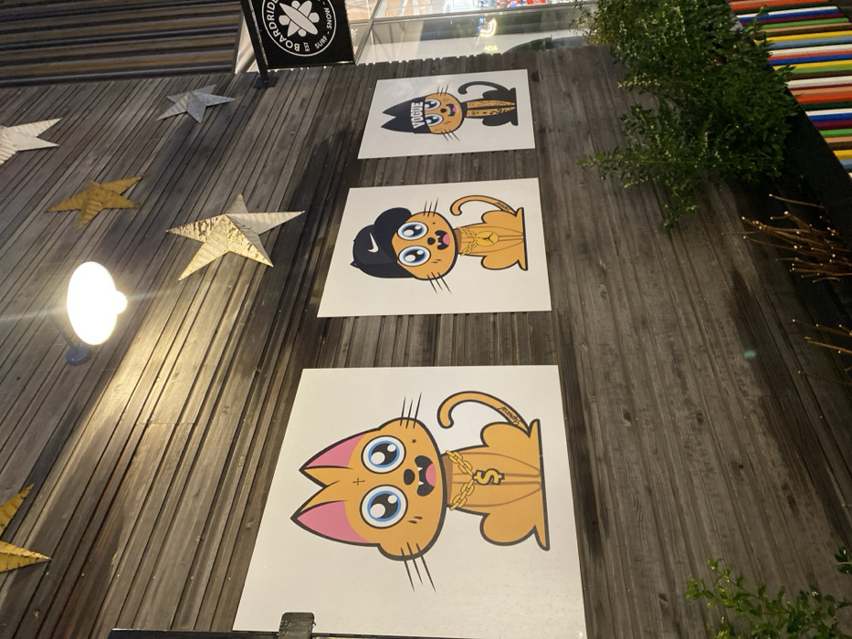 A wooden wall displays three vertically aligned cat cartoon images