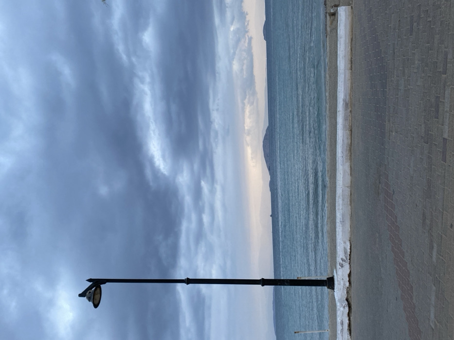 The image displays a static coastal scene under an overcast sky, located in Megalochori, Greece. In the foreground, a paved surface composed of gray and reddish-brown interlocking blocks extends across the lower portion of the frame, bordering a low, off-white concrete curb. A tall, black, classically designed lamppost with a prominent lantern fixture stands on the left side of the paved area, positioned near the curb. Behind the lamppost and at the water's edge, two thin, vertical white posts are partially visible. The midground features a body of calm, turquoise-blue water with minimal surface ripples. On the distant horizon, several dark, rounded landmasses, consistent with islands, are discernible, backed by fainter, hazy coastal mountains. A small, dark vessel is faintly visible on the far left of the water. The sky is heavily covered with dense, dark gray and blue clouds, though a narrow band of lighter, muted sky is present just above the distant horizon. No people are visible in the scene.