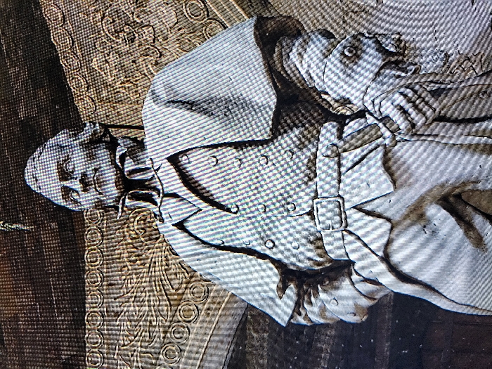 The image is a photograph of a digital screen displaying a light-colored, monochrome statue of a male figure. Visible scan lines and a grid pattern indicate the screen medium. The statue depicts a man from the waist up, facing slightly right and looking upwards with a resolute expression. He is dressed in historical attire, including a high-collared, double-breasted coat with several buttons, a short cape draped over his shoulders, and a belted waist. His right hand is positioned at his side, possibly resting on his hip, while his left hand clutches a tightly rolled object, resembling a scroll or document. The background behind the statue is an ornate, patterned surface, likely architectural carving, featuring repeating circular and curvilinear designs. There are no visual elements within the image to identify a specific physical location in Markurdi, Nigeria.