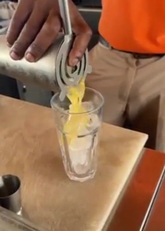 A bartender wearing an orange shirt and khaki pants pours a yellow liquid from a metal cocktail shaker into a glass filled with ice. The shaker has a strainer attached. The pouring occurs on a wooden cutting board on a metal countertop in what appears to be a bar or restaurant setting. Additional bar equipment, including a coffee machine and a small metal measuring cup, are visible in the background. The bartender looks focused on his task as he pours the drink.
