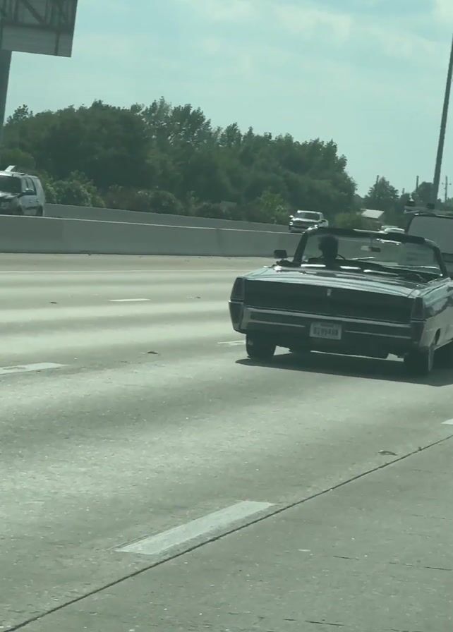 black convertible car driving on a highway, followed by a black sports car. The convertible has a Texas license plate. The road has multiple lanes, with other vehicles visible in the background. The sky is partly cloudy. The perspective is from another vehicle moving alongside the cars.