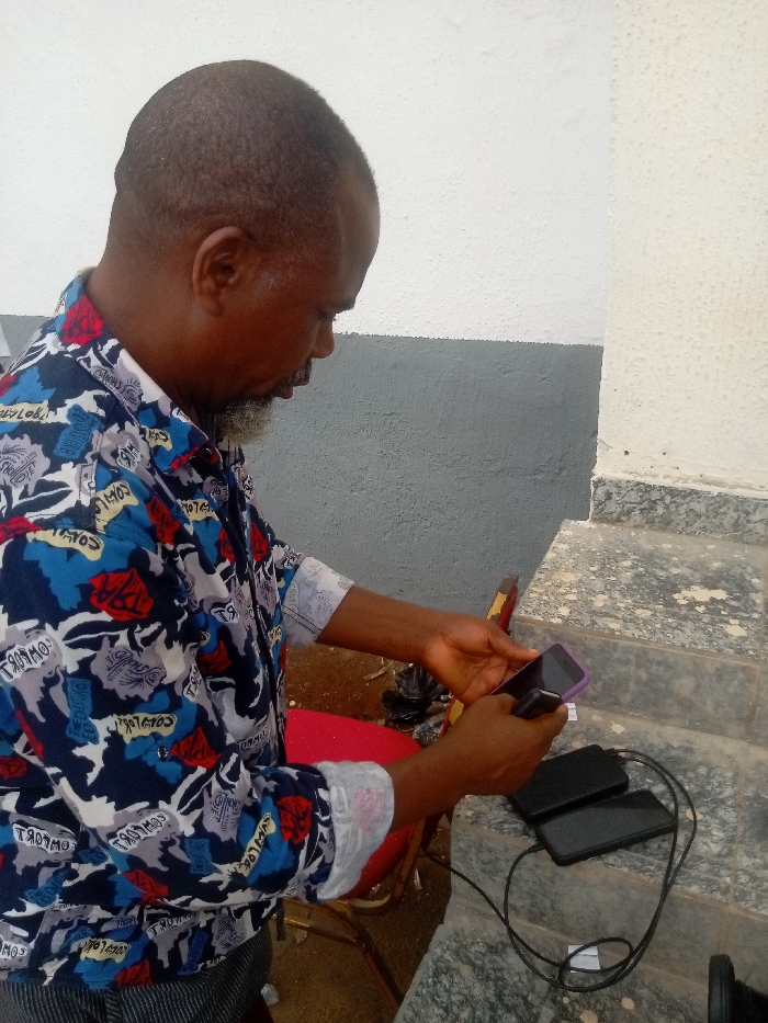 An adult male with short dark hair, a receding hairline, and a dark beard is depicted in an outdoor or semi-sheltered area in Nkpor, Nigeria. He wears a long-sleeved patterned shirt featuring blue, red, white, and black motifs, and dark striped trousers. His attention is directed downwards as he holds a purple-backed smartphone in his left hand and a black charging plug or small device in his right hand, appearing to be engaged in a charging or connectivity action with the phone. On a grey speckled stair step to his right, two additional black rectangular devices, likely smartphones or power banks, are positioned with a black charging cable connecting them; one end of the cable extends out of frame to the lower left. The background consists of a wall painted white on its upper section and dark grey on its lower section. A textured, light-colored vertical pillar or corner is visible to the far right. Red fabric, possibly a chair, is partially visible behind the man's right arm, and a black plastic bag lies on the ground to the left of the steps. The ground directly beneath the man is a reddish-brown, possibly soil or unpaved surface.
