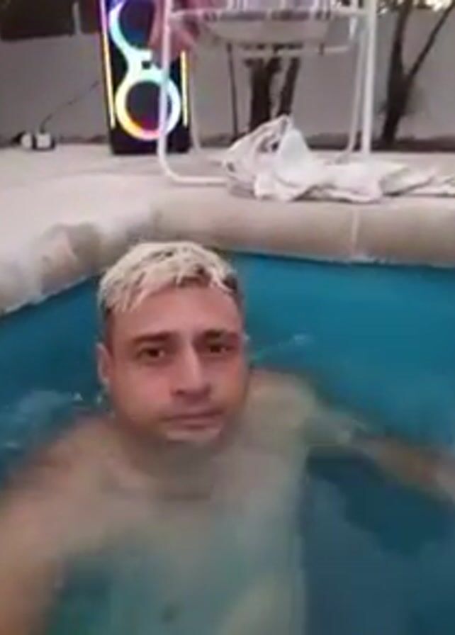 A medium shot captures a fair-skinned man with short, light-colored hair standing in a blue-tiled pool. He's shirtless, and the water comes up to his chest. He faces the camera with a neutral expression. Behind him, on the pool's edge, sits a white, folding lawn chair with a striped cushion and a light-colored towel draped over the back. To the left of the chair is a black speaker with colorful, round LED lights. The background features trees and a fence, suggesting an outdoor backyard setting. The lighting indicates that the video was taken during daylight, possibly late afternoon.