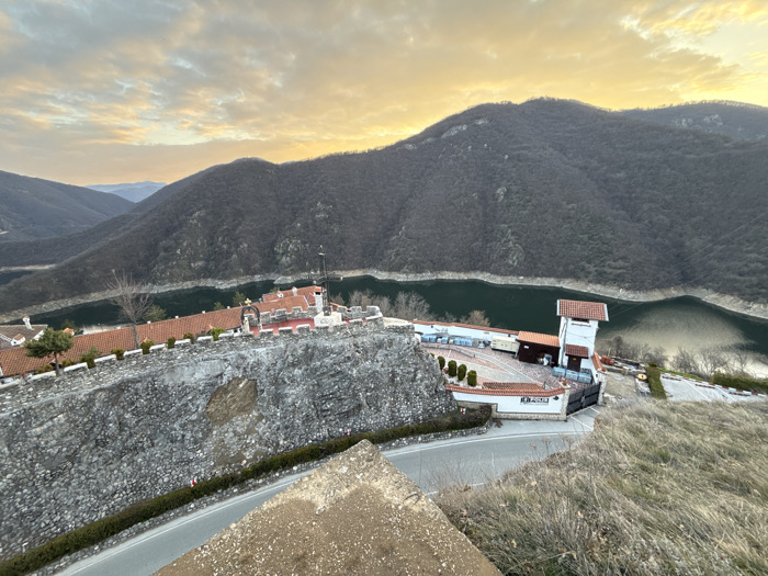 The image displays an elevated view of a complex named "LA PORTA," situated on a hillside overlooking a large body of water, likely a lake or reservoir, in the city of Unknown, Unknown. The sky exhibits orange and yellow hues, indicative of either sunrise or sunset. In the foreground, a steep, dry, grassy slope descends to a winding asphalt road. This road runs parallel to a robust grey stone retaining wall that supports the complex above. The midground features a cluster of buildings with distinct reddish-orange tiled roofs. A prominent white-faced structure includes a square tower with a matching tiled roof. An adjacent paved courtyard or terrace contains multiple tables and chairs, forming an outdoor seating area. Manicured evergreen shrubs are visible, and a flagpole stands above the buildings. The background is dominated by a dark green body of water, bordered by steep, densely forested mountains. No individuals or specific activities are observed within the frame.