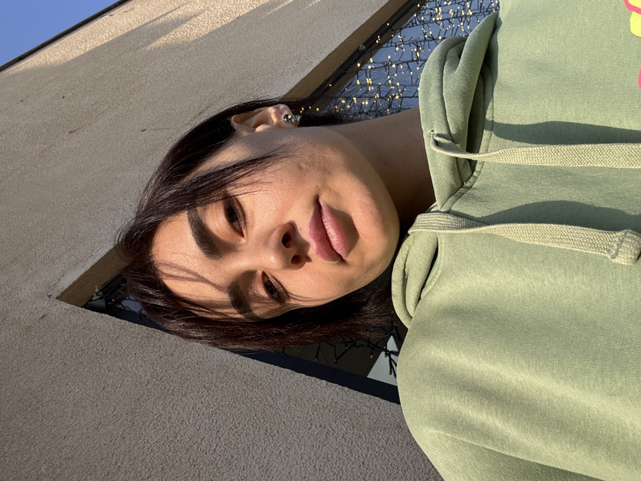 A person is posing outdoors on a sunny day. The subject, tilted slightly, is wearing a pale green hooded sweatshirt. The person has dark hair and defined eyebrows. Sunlight casts shadows on their face and the garment. The background includes a light-colored building and a window adorned with string lights. The overall impression is casual and relaxed.