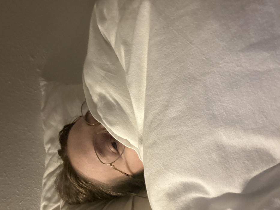 This image depicts an individual lying in a bed within an indoor setting, situated in Madrid, Spain. The subject is partially visible, with brown, tousled hair resting on a white pillow. Light-colored, thin wire-frame glasses are worn, with a tortoiseshell pattern visible on the right temple piece. The right eye is open and directed towards the viewer, while the rest of the face and body are obscured by a white duvet or blanket pulled up high, showing soft folds and creases. The background consists of a textured, light-colored wall above the pillow. The lighting is dim and indirect, creating soft shadows.