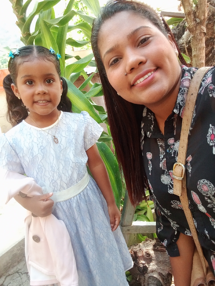 The image displays two smiling females in an outdoor setting in Las Tejerías, Venezuela. On the right, an adult female with dark hair and fair skin is positioned at an angle, looking directly at the camera. She wears a dark button-up shirt featuring an intricate repeating pattern of pink, white, and black jewel-like designs. A light brown, textured shoulder bag strap with a gold-colored buckle is visible across her chest. She has a small stud piercing on her left nostril and small stud earrings. To her left, a young female child stands, facing the camera. Her dark hair is styled into two pigtails, each adorned with two light blue flower-shaped clips. The child wears a light blue lace dress with a white waistband and short, puffed sleeves, along with a gold-colored necklace featuring a small pendant. In her left hand, she holds a light pink garment, possibly a jacket, which has a visible brown button. The background features dense green foliage, including large leaves and a section of a tree trunk with rough bark. A light-colored wall or structure is partially visible in the upper left, and a wooden or metal post stands between the two individuals. Both subjects are looking forward with smiles.