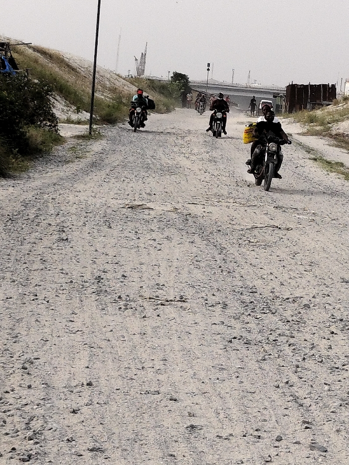 A long, uneven, dirt and gravel road slopes upwards. Several motorcycles approach the viewer, carrying riders, some with passengers or cargo. A bridge crosses the road in the distance. Sparse vegetation and industrial features are visible on either side of the road. The sky is overcast.