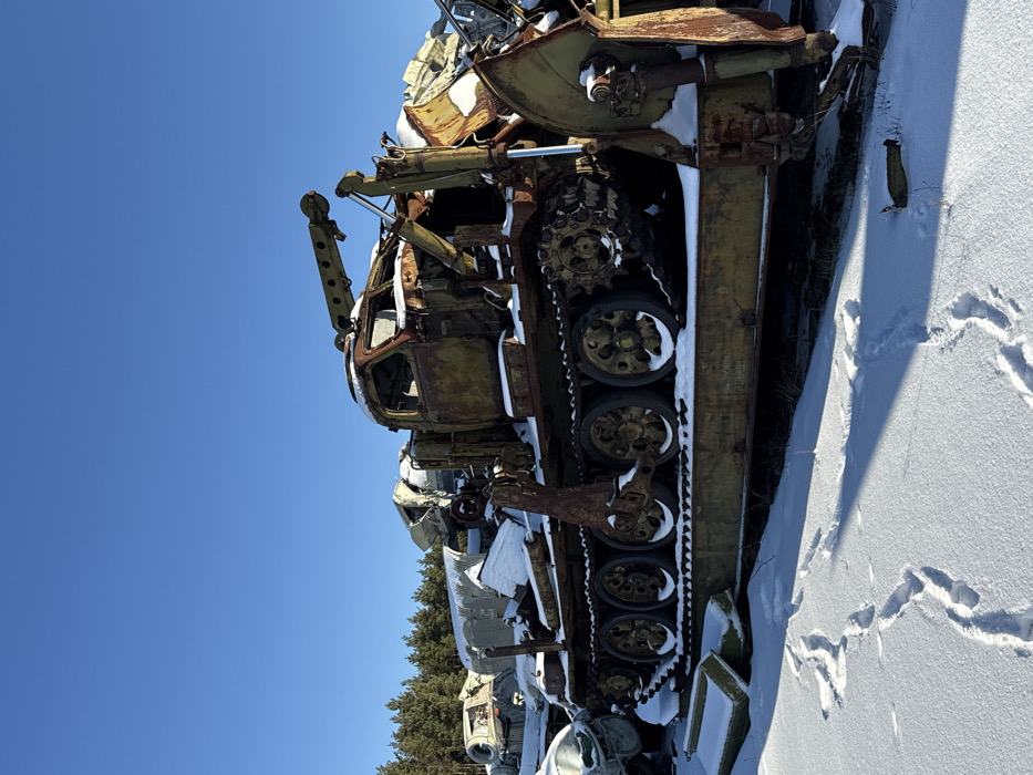 The scene depicts an outdoor salvage or storage area for heavy machinery and vehicle components in a city in Unknown, Ukraine. The ground is covered in a layer of white snow, marked by multiple sets of human footprints in the immediate foreground. The dominant subject is a heavily corroded, olive-green tracked vehicle, likely a specialized engineering or recovery machine, positioned in the midground. This vehicle features a stripped-down truck-style cabin with missing windows, a partially disassembled boom arm on its rear deck, and a large, rusted blade mechanism at its front right. Snow partially covers the vehicle's horizontal surfaces and track mechanisms. To the left and behind this vehicle, additional piles of derelict metal, including what appear to be sections of aircraft fuselages and other industrial components, are visible, also covered in snow and showing signs of significant rust and disrepair. A dense line of dark green coniferous trees forms the horizon in the background, beneath a clear, bright blue sky. Long shadows extend across the snow, indicating low sunlight. No individuals are present in the image.