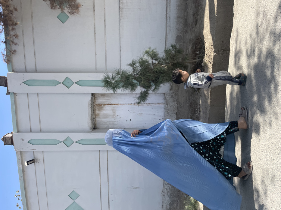 A woman in a blue burqa walks along a sidewalk next to a white wall with diamond-shaped decorations. A small evergreen tree grows near the wall. A young boy wearing a gray and white tracksuit lies on his back next to the tree, looking upwards. The woman's feet and star-patterned pants are visible beneath the burqa.