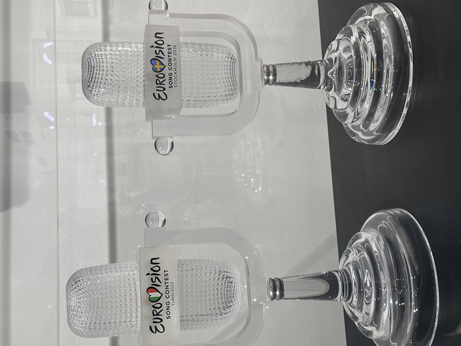 Two stylized clear glass microphone trophies are displayed side-by-side on a dark, flat surface against a reflective white background. The trophy on the left features a translucent U-shaped band inscribed with "EURO**vision** SONG CONTEST TURIN 2022", where the 'V' incorporates the green, white, and red vertical stripes of the Italian flag. The trophy on the right bears a similar U-shaped band with "EURO**vision** SONG CONTEST STOCKHOLM 2016", its 'V' incorporating the blue and yellow cross of the Swedish flag. Both trophies consist of a textured cylindrical top, a U-shaped support structure, a clear stem, and a layered circular base, with a silver-colored ring accentuating the connection between the stem and the support structure. No individuals are present. The specific location within Kyiv, Ukraine, is not discernible from the image content.