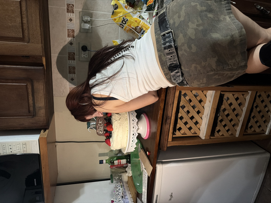 The image depicts an indoor kitchen scene in Quilmes Oeste, Argentina. A female subject, with long reddish-brown hair, wearing a white ribbed tank top, a visible black bra strap, a wide black patent leather belt, and a camouflage mini-skirt, leans forward with her elbows on a dark wooden countertop. She is looking down at a light-colored, two-layer cake topped with strawberries and blueberries, situated on a white cake stand with a pink base. Behind the cake, a small dark sign displays "21 BLACK." To the left of the subject, on a white countertop, are a small white Whirlpool refrigerator, a set of silver tiaras in a plastic holder, a green glass bottle, and a green plastic tray. Above this counter, a white Samsung microwave rests on a shelf. Dark brown wooden cabinets are mounted on the wall above the main countertop. The wall is tiled with light-colored square tiles and a decorative patterned border. Two electrical outlets with plugged-in cords are visible on this tiled wall. To the right of the cake, a yellow bag of "Doritos" chips and other items are loosely arranged on the counter. Below the wooden countertop is a narrow wooden cabinet featuring three latticed storage compartments. The floor consists of dark-toned tiles.