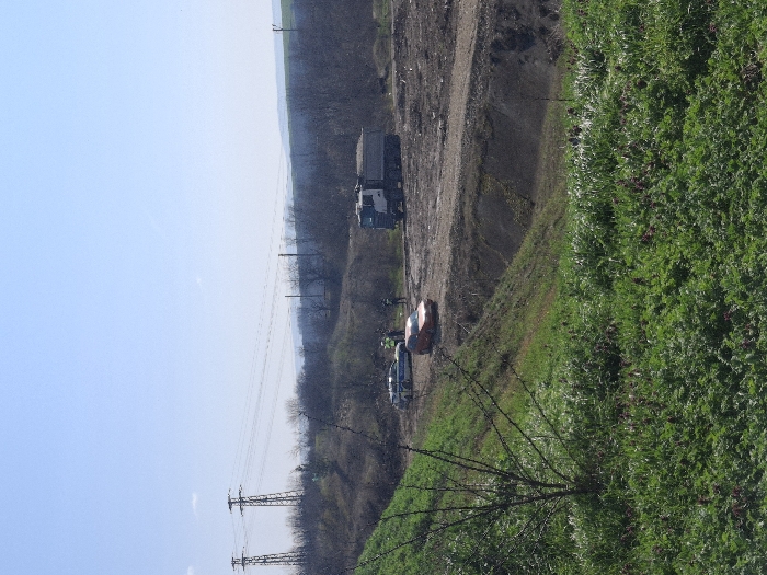 The image displays an outdoor scene under a clear blue sky, situated in the city of Shumen, Bulgaria. The foreground features a steep, verdant embankment covered with lush green plants, some with small purplish blooms, and a bare thorny shrub on the left. Below this embankment, an unpaved dirt road or worksite area extends into the midground. On this path, a white and blue marked police SUV is parked, followed by an orange compact sedan. Further along the path to the right, a white semi-truck with a dark grey dump trailer, partially loaded with bulk material, is stationary. A cluster of approximately five to seven individuals, some wearing dark uniforms consistent with law enforcement, are standing near the police vehicle and the orange sedan. The midground beyond the road reveals slopes of dry, excavated earth and sparse vegetation. In the background, two prominent metal lattice-type electricity pylons are visible on the left, supporting power lines. The horizon features distant, rolling hills covered with dormant deciduous trees and light green fields.