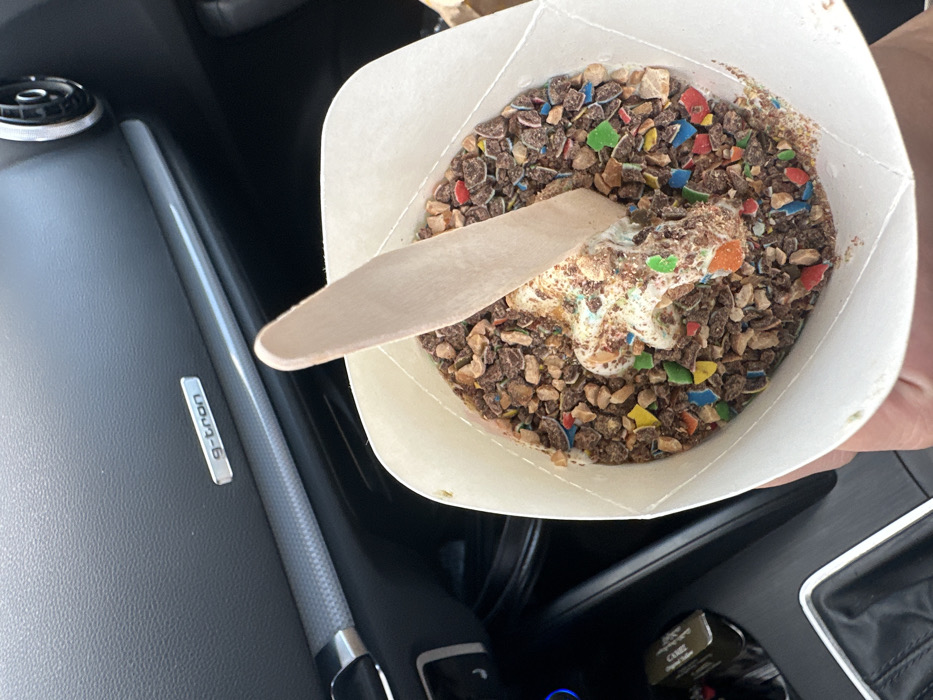 - "A close-up, high-angle image captures a person's hand holding a white paper cup containing a dessert, situated within the interior of an Audi g-tron vehicle" by FM-clbjN2, licensed under CC BY 4.0