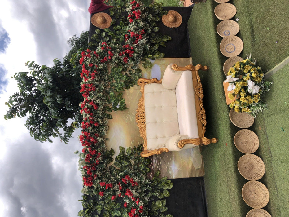 The image depicts an outdoor event setup in Amanuke, Nigeria, under an overcast sky. A cream-colored two-seater sofa, featuring an ornate gold-painted wooden frame and button-tufted upholstery, is centered on a raised platform covered in artificial green turf. Behind the sofa, a backdrop is arranged, consisting of a central light-colored panel with a blurred design, flanked by two black panels. Artificial green foliage and numerous red roses are draped across the top and down the sides of the backdrop, forming a floral arch. Two circular woven straw hats are affixed to the right black panel, with a piece of dark red fabric draped nearby. In the foreground, on the green turf, a row of approximately ten circular, light-brown woven mats or shallow baskets is present. A bouquet of artificial yellow and white flowers with green foliage sits on the turf to the right of these mats, partially obscuring a small, light-colored rectangular object. A large green tree is visible in the background, above the floral display. No individuals are present.