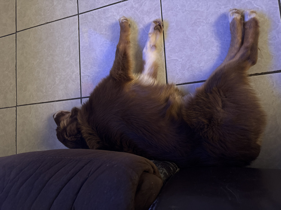 A medium-sized canid with dense, reddish-brown fur is depicted in a state of lateral recumbency, resting on a light-colored, possibly off-white or light gray, tiled floor. The animal's body is elongated, with its head oriented towards the upper left of the frame, appearing to rest against a large piece of dark brown upholstered furniture, likely a sofa or armchair, partially visible on the left. The dog's eyes are closed, indicating sleep or deep rest. Its front limbs are partially obscured, while its hind limbs are extended with visible paws, some exhibiting white markings on the lower extremities. The tiled floor features dark grout lines forming a grid pattern. Ambient lighting, emanating from an unseen source, casts a distinct blue-purple hue across portions of the tiled surface, particularly around the dog's midsection and hind legs. The scene is observed indoors, within the city of Hermosillo, Mexico. No other subjects are visible.
