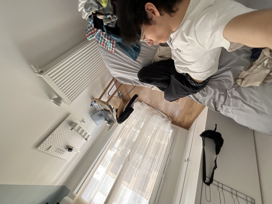 The image displays an interior view of a residential room, likely a bedroom, situated in Villeneuve-d'Ascq, France. The perspective is tilted, originating from a low angle on a bed. A person with dark hair and glasses occupies the foreground, lying on their left side on a bed. They wear a white t-shirt and dark trousers, with a patterned lining visible on the inner ankle of the trousers. Their head is turned to the right, and their left arm is extended towards the camera, suggesting a selfie. The bed is covered with light gray bedding, upon which numerous items of clothing, including a plaid shirt, are casually strewn. To the right of the individual's line of sight, a light-toned wooden L-shaped desk is positioned against the wall. The desk holds an open laptop, a computer monitor, and several plastic water bottles. A light wooden chair, draped with a dark garment, is partially visible beneath the desk. Behind the desk, a large window fitted with light-colored horizontal blinds allows ambient light into the room. Above the desk and window, a white pegboard system is mounted on the wall, holding various small items and shelves. Adjacent to the pegboard, a white horizontal panel radiator is mounted high on the wall, below the ceiling. The walls and ceiling are painted white. The floor beneath the desk and window is light-toned wood. A portion of a white wardrobe or dresser is visible to the left of the bed, with a black strap hanging from its side.