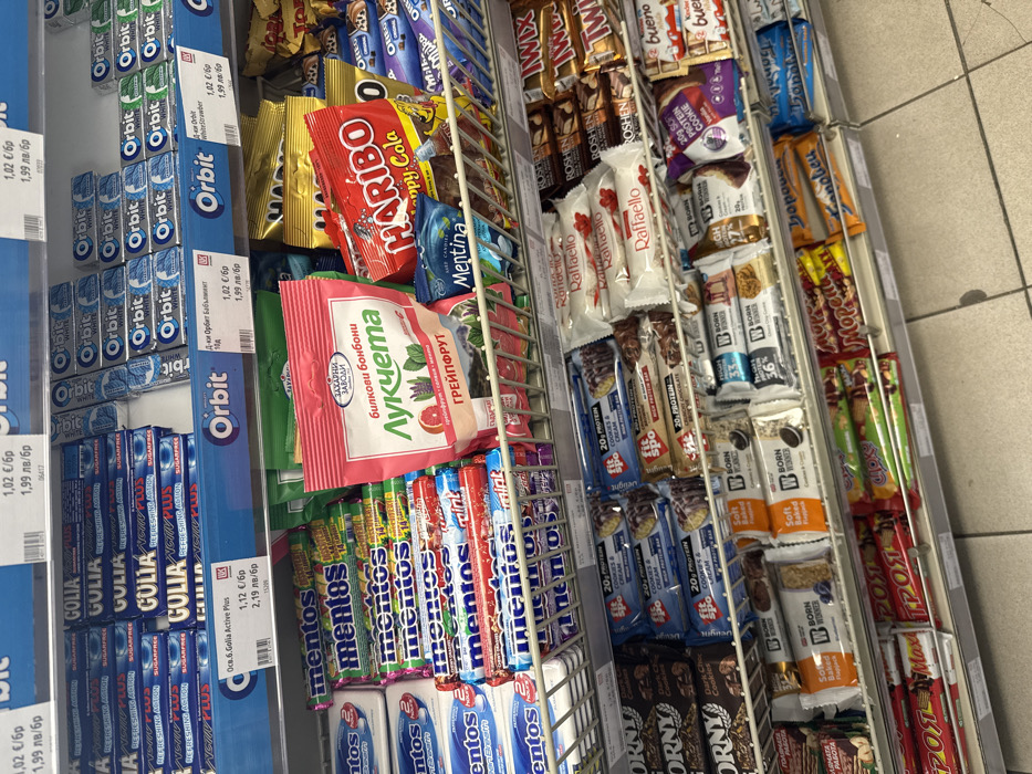This image depicts a retail display of confectionery and snack items within a commercial establishment in Pazardzhik, Bulgaria