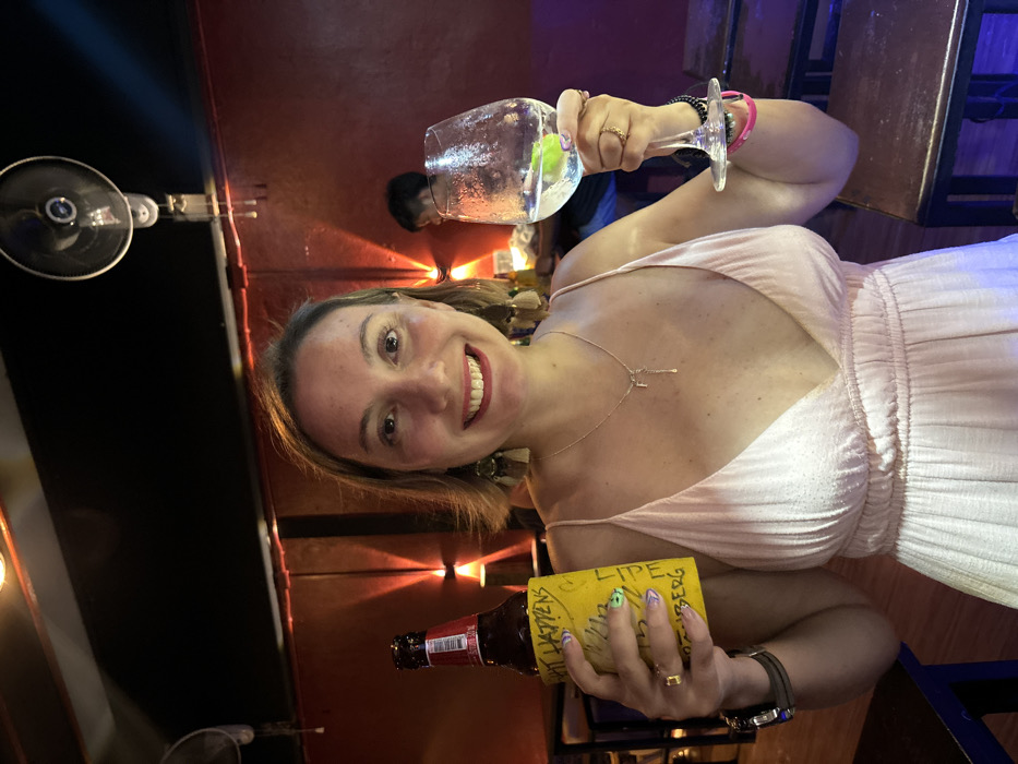 The image depicts an indoor bar or restaurant scene in Ban Ko Li Pe, Thailand, characterized by dim, reddish-orange lighting emanating from wall sconces. A Caucasian female, estimated to be in her mid-20s to mid-30s, is centrally positioned, smiling broadly at the camera. She has shoulder-length light brown hair and wears a light-colored, possibly pink or beige, V-neck spaghetti strap dress. She is accessorized with a silver-colored necklace featuring an 'F' initial pendant and light-colored tassel earrings. On her left wrist, she wears a dark watch and bracelet, and a gold-colored ring on her left ring finger. Her left hand holds a brown beer bottle within a yellow foam koozie that displays handwritten text including "HAT HAPPENS," "LIFE," and "BERG," along with a green frog or alien-like illustration. Her left hand's fingernails are painted with designs. In her right hand, she holds a stemmed wine glass containing a clear beverage with a lime wedge, exhibiting condensation. Her right wrist is adorned with multiple bracelets, including a pink one and black beaded ones, and a ring is visible on her right ring finger. In the blurred background, a person with dark hair is partially visible from behind, seated at a table or bar. The environment includes reddish-orange walls with visible seams, a dark ceiling, and two wall-mounted oscillating fans, one in the upper left and one in the upper right of the frame. Dark-colored, metal-framed furniture is partially visible in the foreground and background.