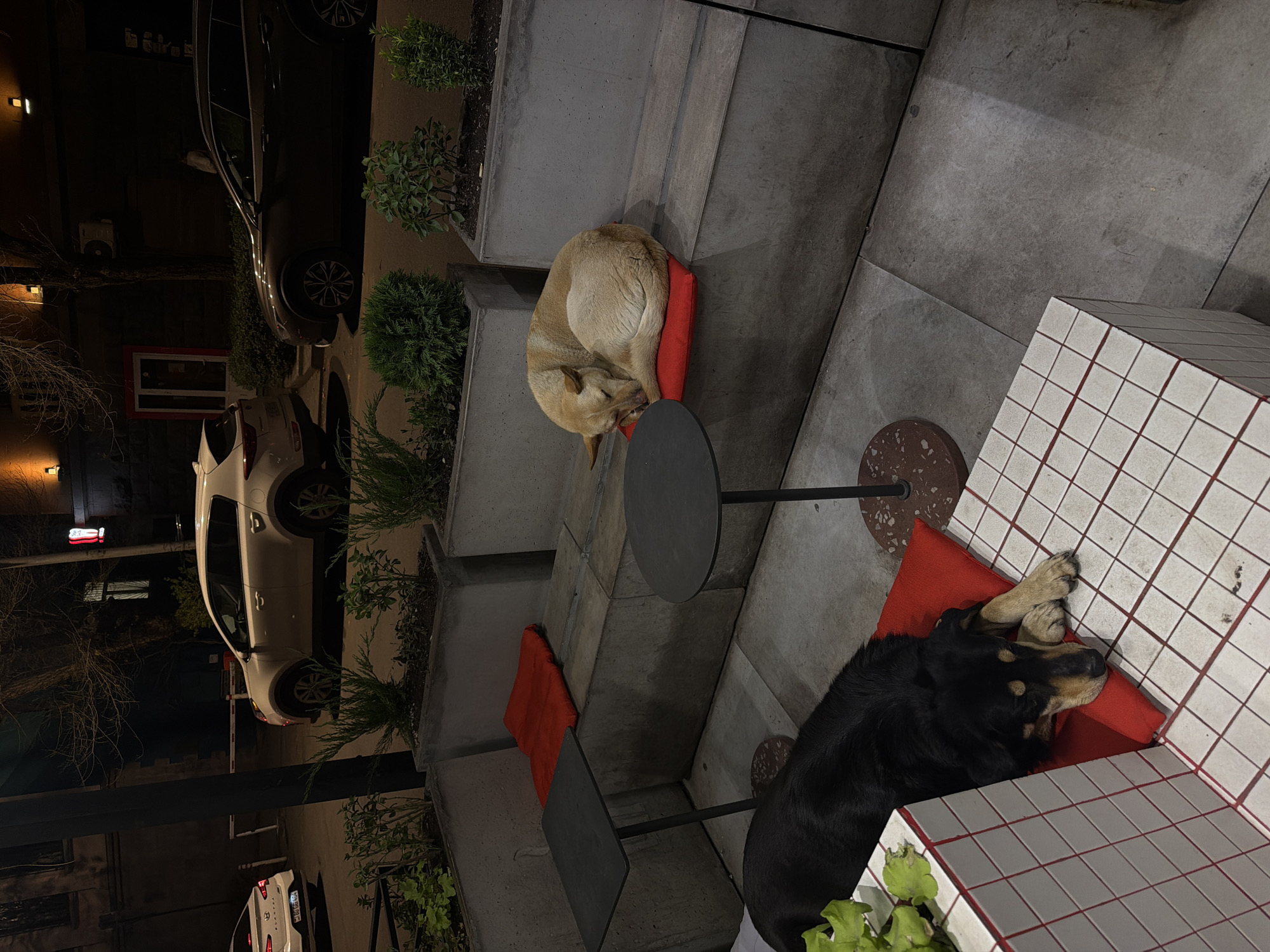 Two dogs are sleeping on red cushions outside a building with white-tiled exteriors in Yerevan, Armenia. One dog is light tan and curled up, while the other is black and tan with paws crossed. Both are resting on red cushions next to a small black table and a tiled structure. The location appears to be a public outdoor space, possibly a patio or sidewalk area. Street lighting is visible, and cars are parked nearby.