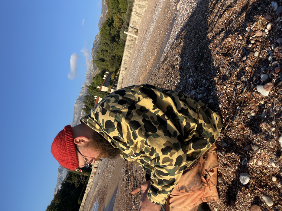A bearded male individual is seated in profile on a coarse, pebbly beach in Sveti Stefan, Montenegro. He wears a bright red knit beanie adorned with a small, multi-colored charm, eyeglasses, a long-sleeved yellow, green, and brown camouflage shirt, and faded orange trousers, appearing distressed at the knee. His right hand is partially visible near his lap, with the thumb extended upwards, suggesting interaction with an unseen object. The beach comprises varied-sized and colored pebbles (brown, red, grey, white) and slopes towards a calm body of water in the mid-ground. Behind the waterline, a low retaining wall constructed of light-colored material borders an area with green trees and multiple buildings featuring red-tiled roofs and light-colored walls. In the far background, rugged grey mountains rise under a clear blue sky with a few wispy clouds. The lighting indicates a low sun angle, casting prominent shadows across the beach from the right side of the frame.
