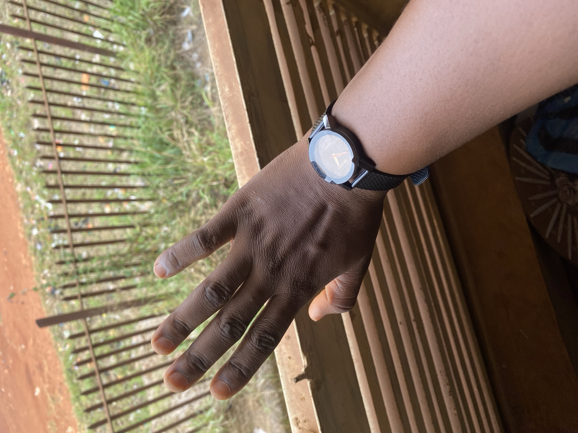 An arm and hand, adorned with a black watch featuring an orange face, are positioned against a blurred backdrop of brown metal bars and green vegetation. The hand is outstretched with fingers spread. The location appears to be a fenced-in area, as the metal bars obstruct the view of the outside environment. While the image suggests an outdoor setting, specific details linking it directly to Nsukka, Nigeria, are absent without additional context.