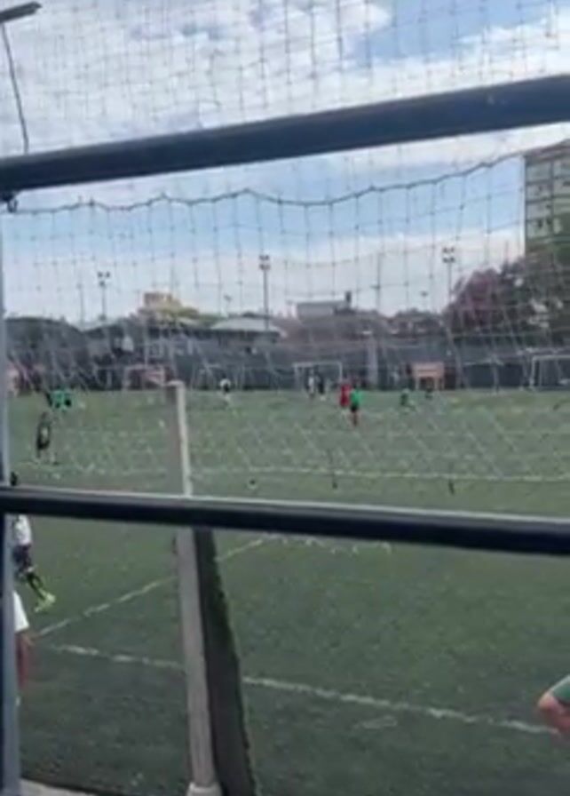 soccer game taking place on a green artificial turf field. The camera is positioned behind a fence and netting, partially obscuring the view. Several players in green and red jerseys are visible on the field. In the foreground, a man in a green shirt is leaning against the fence, watching the game. Buildings and trees are visible in the background, under a partly cloudy sky.