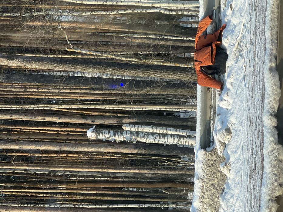 The scene depicts a winter landscape in Vsevolozhsk, Russia, with a snow-covered environment adjacent to a dense forest. In the foreground, a dark grey barrier or guardrail, partially covered by accumulated snow and ice, runs horizontally. On the far side of this barrier, an orange jacket is draped over a black backpack, resting directly on the snow. The background is dominated by a thick stand of tall, slender trees, comprising both reddish-brown conifers and white-barked birches. Many of the deciduous trees are bare, consistent with winter conditions. The forest floor is covered in snow, and several broken birch trunks exhibit snow caps on their tops. Sunlight illuminates the tree trunks, and a blue lens flare is visible in the central-right area of the forest. No individuals are present in the image.