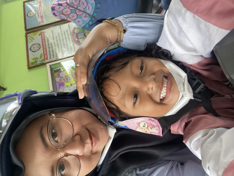 A selfie shows a woman and a child, both smiling. The woman wears glasses and a hijab under a helmet. The child wears a helmet and a face mask and sports a pink and white jacket. Two framed documents hang on a green wall in the background. One sign is partially obscured, while the other, a school rule, is titled "Tata Tertib Bertama ke Sekolah" (School Rules).