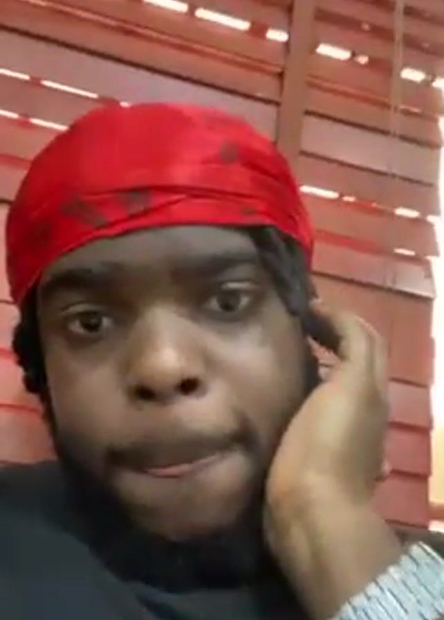 A close-up video features a Black man wearing a red patterned durag, a black T-shirt, and a silver watch
