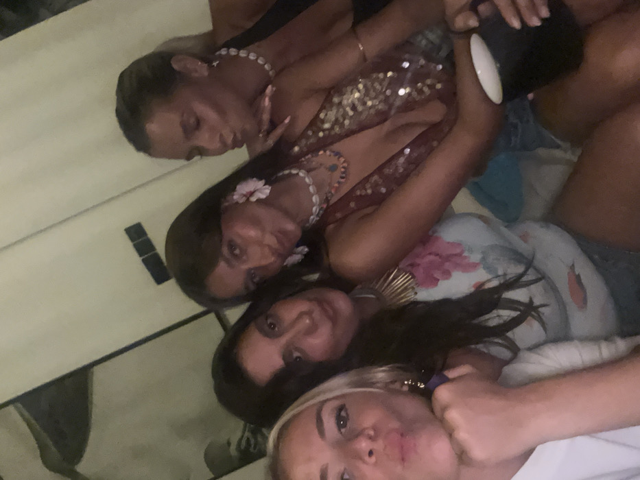 Four adult females are depicted in a low-light, selfie-style photograph taken indoors, likely a private residence or lounge, in Canggu, Indonesia