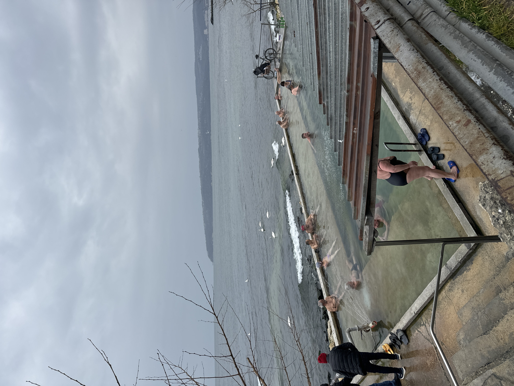 The image presents an outdoor thermal bath facility situated along the Black Sea coast in Varna, Bulgaria, on an overcast day. The foreground features a concrete pathway leading to two adjacent rectangular concrete pools. Approximately 14 individuals are present in the scene. Ten individuals are submerged in the pools, primarily adults or elderly, wearing swimwear. One person in the left pool is being directly hit by a stream of water from a grey metal pipe with a nozzle. Two individuals stand on the wet concrete path to the left, one wearing a red beanie and a dark puffer jacket. Another person in a black one-piece swimsuit stands on the concrete edge of a pool, with blue and black flip-flops placed nearby. A fourth individual is partially submerged in the lower right portion of the right pool. The background is dominated by the calm, grey waters of the Black Sea, showing small waves near the shore. Several white swans are visible swimming in the sea close to the pools. A distant, hilly coastline covered with vegetation stretches across the horizon. The sky is uniformly overcast with grey clouds. Bare tree branches, devoid of leaves, extend into the upper left quadrant of the frame. To the right, a multi-tiered structure with corrugated brown metal panels runs parallel to the pools. A black bicycle with a rear rack is parked near a metal railing on the right, overlooking the sea. A rusted metal guardrail runs diagonally from the mid-right to the lower right. Small patches of green vegetation are visible beyond the guardrail.