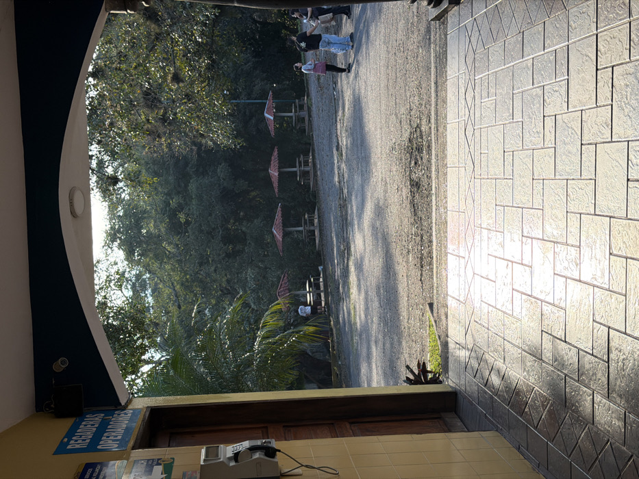 A view from inside a building to an outdoor area. The floor inside is covered with light-colored tiles, and there is a counter or desk area with a phone and signs. Outside, there is a gravel path with people walking, picnic tables with red umbrellas, and a lush green forest in the background. The image is taken from a doorway or window.