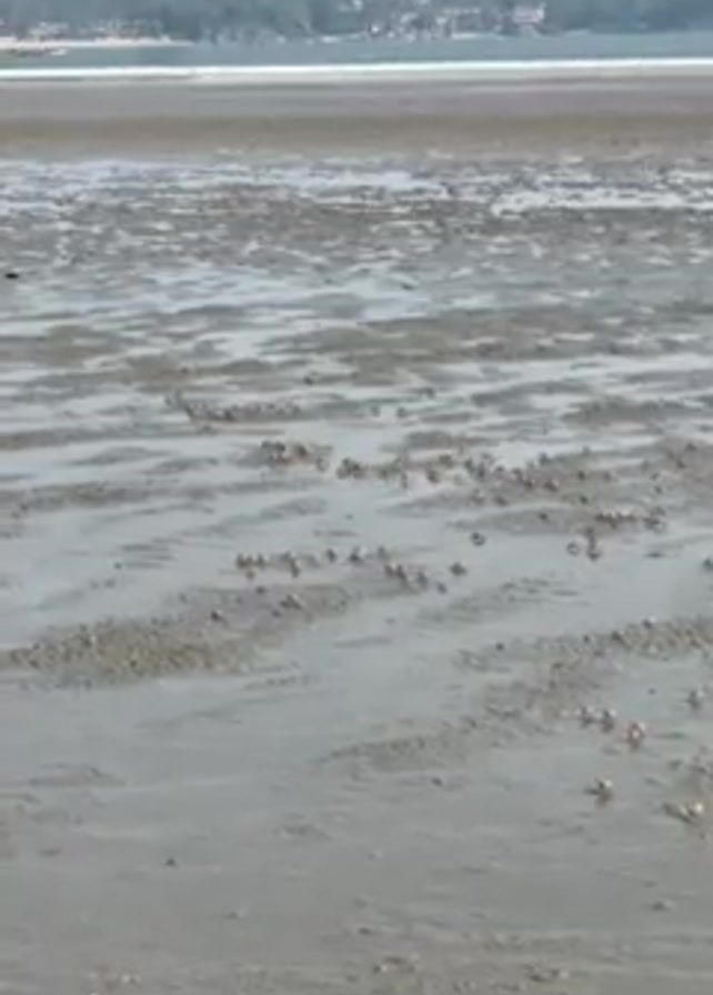 wide, wet, sandy beach at low tide, with small crabs scattered across the surface