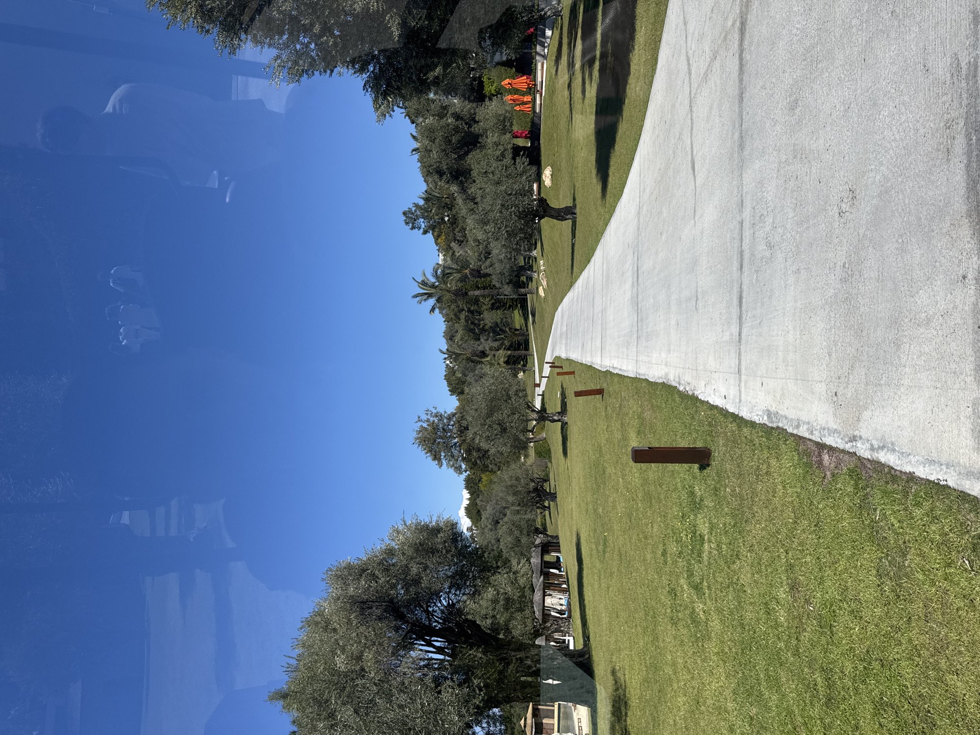 The scene is a landscape likely in Bodrum, Turkey, viewed through a window with reflections, depicting a concrete path extending into the distance. The path is flanked by well-maintained green lawns. Trees are scattered throughout the area, some appearing as olive trees. There are occasional small rectangular wooden posts alongside the path. Further in the distance, orange parasols are visible, suggesting a resort or recreational area. The sky is clear blue, reflected in the window, along with indistinct shapes that appear to be reflections of people.