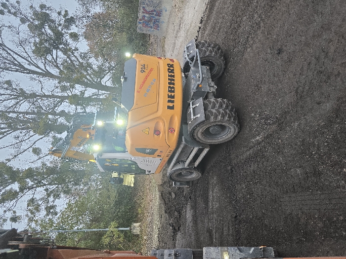 The scene depicts a construction or earthmoving site within the city of Sessenheim, France. A yellow and white Liebherr 914 wheeled excavator is the dominant subject, positioned slightly angled to the left, with its rear facing the viewer. The excavator bears the branding 'LIEBHERR' and the designation '914', along with the contractor's name 'E. NOUNENMACHER' and a phone number '03 88 72 82 86'. Multiple LED work lights on the excavator's cabin and boom are illuminated. Its arm and boom are extended upwards and to the left. The ground is composed of dark, disturbed earth and gravel, showing distinct tire tracks. On the far left, a section of an orange heavy vehicle is partially visible. The background features numerous tall, deciduous trees, many heavily laden with mistletoe, set against an overcast sky. A concrete barrier displaying graffiti is visible on the far right. No individuals are present within the frame.