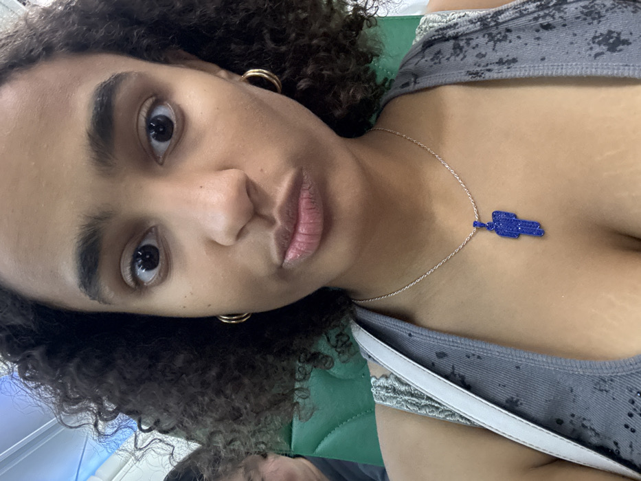 A young woman with medium-toned skin and dark, curly hair faces the camera directly, her eyes wide and lips slightly pursed. She wears small, gold-colored hoop earrings and a grey, patterned sleeveless top. A silver-colored chain necklace with a dark blue, stylized human-figure pendant rests on her chest. A white strap, likely from a bag, is visible over her left shoulder. In the blurred background to the left, a portion of another individual's head and shoulder is visible. The immediate background consists of green upholstered seating, suggesting an indoor public transport or waiting area. There are no discernible features in the image to confirm the location as Paray-Vieille-Poste, France.