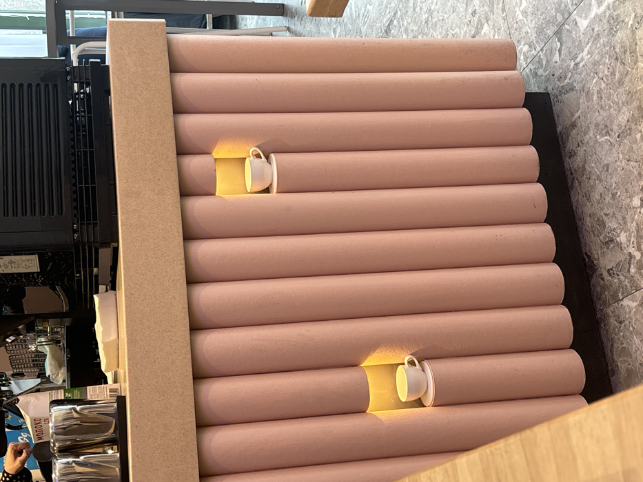 This image depicts an interior view of a commercial establishment, likely a cafe, located in Zelenogradsk, Russia. The central focus is a counter with a light tan top surface. The counter's facade is constructed from vertically arranged, half-cylindrical elements in a muted pink hue. Two recessed niches are embedded within this pink facade; each contains a single white ceramic cup resting on a small, circular, elevated platform, illuminated by warm yellow light from an internal source. Above the counter, from left to right, are two polished metallic cylindrical containers, a stack of white paper napkins, and a white carton labeled "МОЛОКО 3.2%" (Milk 3.2%). A dark, commercial-grade appliance, consistent with a coffee machine or refrigeration unit, occupies the right side of the counter's upper surface. The upper left portion of a person's forearm and hand, clad in a blue sleeve, is visible near the metallic containers, performing an unspecified action. The floor consists of grey-toned tiles with an irregular pattern. A partial view of a light-colored wooden table surface is present in the lower-left foreground.