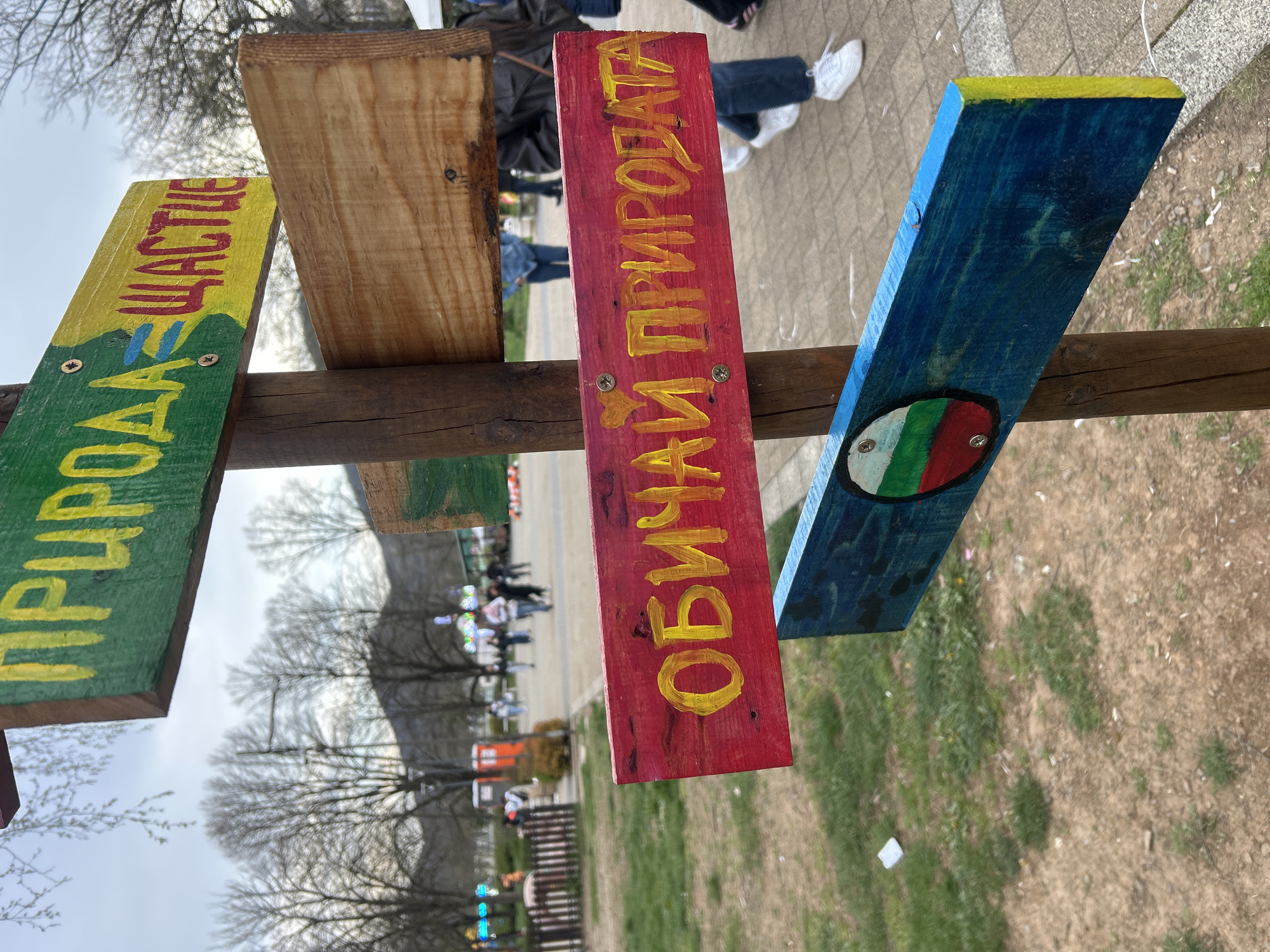 wooden signpost with several painted wooden planks attached to it. The signpost is located in Botevgrad, Bulgaria, likely in a park or public area. One plank, painted green and yellow, has the Cyrillic words "ПРИРОДА ЩАСТИЕ" written on it in yellow. Another plank is plain wood. A third plank is painted red and has the Cyrillic words "ОБИЧАЙ ПРИРОДАТА" written in yellow. A fourth plank is painted blue with a yellow top edge and features a representation of the Bulgarian flag. In the background, there are people walking on a paved area, trees without leaves, and distant mountains. The overall scene is likely outdoors on a cloudy day.