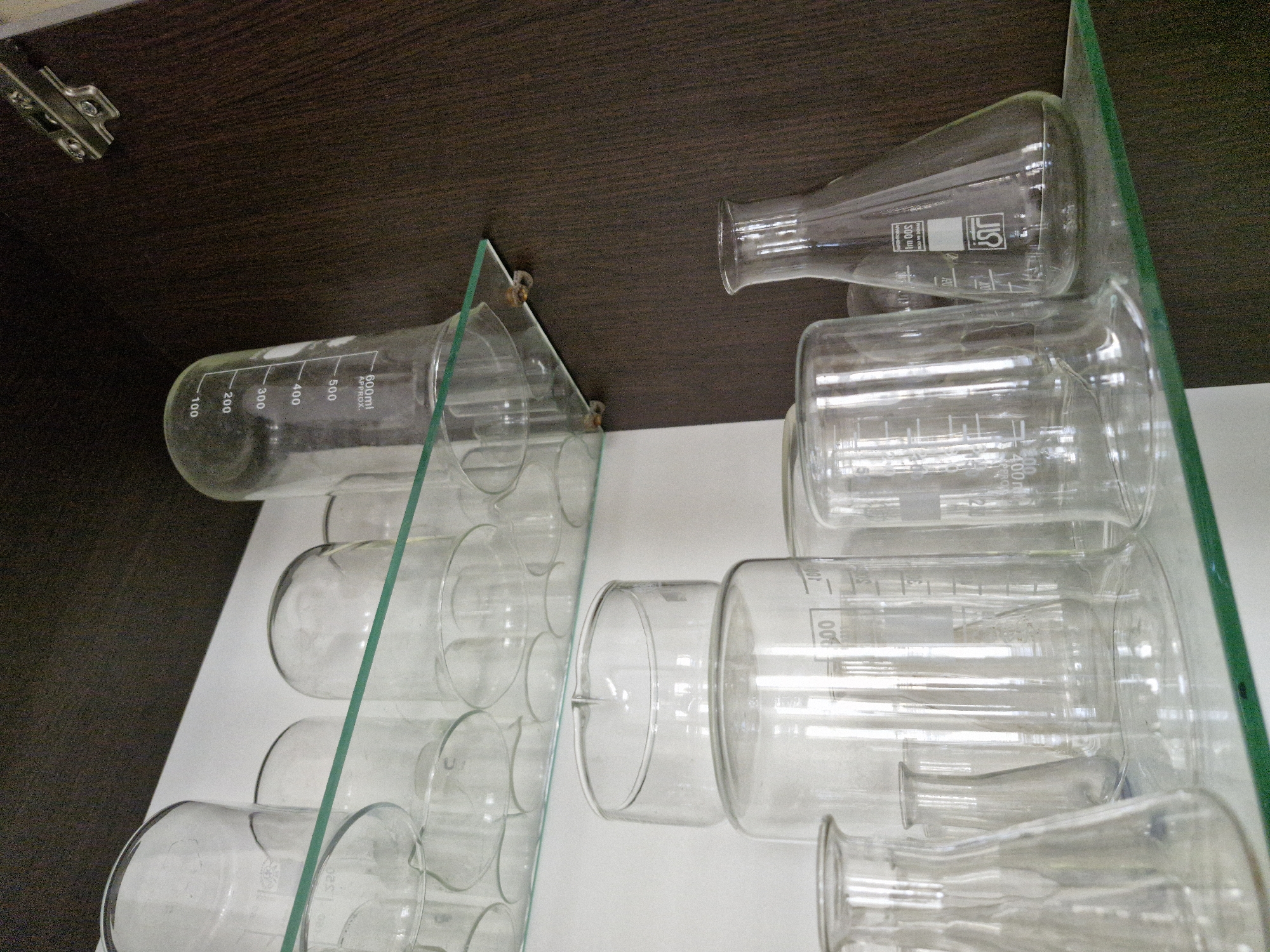 set of laboratory glassware stored on glass shelves inside a dark brown cabinet