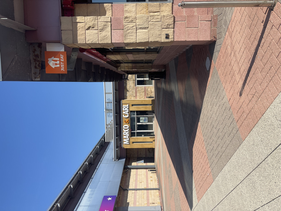 view of a paved area outside a shopping mall in Bradford, UK, located at 53.791 latitude and -1.747 longitude. The mall is made of light-colored brick and has a large sign on the exterior that reads "Marco & Carl". There is a small, orange sign hanging from the wall that reads "Just Eat". The paved area is mostly empty, except for a black garbage can in the distance and a single, shiny silver pole. There is a shadow cast on the pavement from the overhanging wall and roof, which is made of brick and has some kind of light grey material covering it. The sky is blue and there are no clouds. The scene appears to be taken in the early afternoon as the sun is high in the sky. There are no people in the image. The image has a high quality of detail and appears to be a still shot from a high-resolution camera.