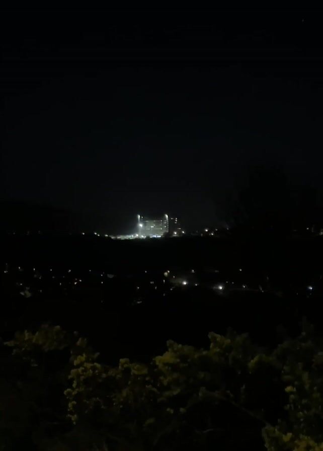 nighttime view from a high vantage point overlooking a lit-up building in the distance. The foreground is dark with silhouetted vegetation, obscuring details. There are also smaller lights, likely from houses or streetlights, scattered throughout the darkened landscape between the viewer and the main building. The sky is a solid black.