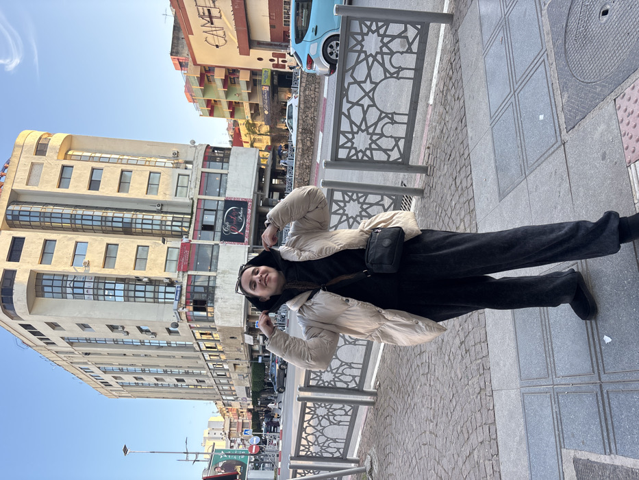 A woman in a beige jacket and dark clothing poses on a sidewalk. The backdrop features an urban landscape with a tall, older building with numerous windows and a mix of retail and residential spaces. Ornate metal fencing separates the sidewalk from the street. Various vehicles and a hint of blue sky complete the scene. The image is rotated clockwise.