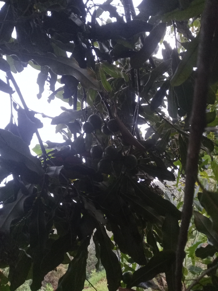 The image depicts an upward-angled view into the canopy of a fruit-bearing tree in Kiangochi, Kenya