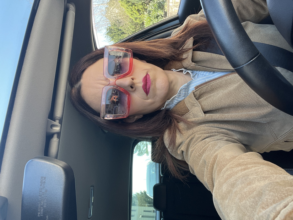 The image depicts a female individual occupying the driver's seat of a vehicle, positioned on a paved road within Roodt-sur-Syre, Luxembourg, on a clear, sunny day. The subject is a mature female with shoulder-length, dark brown hair. She wears oversized, square-framed sunglasses featuring a reddish-pink gradient tint, obscuring her eyes. Her lips are colored with dark red lipstick. She is dressed in a light blue and white striped shirt with a ruffled collar, layered beneath a tan-colored, textured jacket, likely made of suede. A dark-colored seatbelt is fastened diagonally across her chest and right shoulder. Her left hand is partially visible, resting on a black, textured steering wheel. The subject is engaged in a self-portrait, looking directly at the camera with a neutral expression. The vehicle's interior features a light grey headliner. A black rearview mirror, centrally mounted, displays patent text and numbers. Through the vehicle's rear window, a light-colored car is visible, parked directly behind. Reflections in the subject's sunglasses reveal a street scene with residential architecture, including a prominent two-story building with reddish-brown walls and a dark roof, alongside street elements and bare deciduous trees. The rearview mirror also reflects a light-colored building with a dark roof. The passenger side window offers a view of a clear blue sky and additional bare trees, indicating a cool season such as late autumn, winter, or early spring. The environment appears residential.