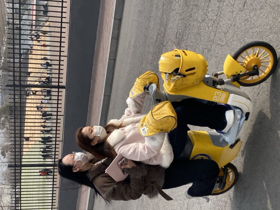Two East Asian females are observed riding a bright yellow and white electric scooter on a paved surface in Zhongtun, China